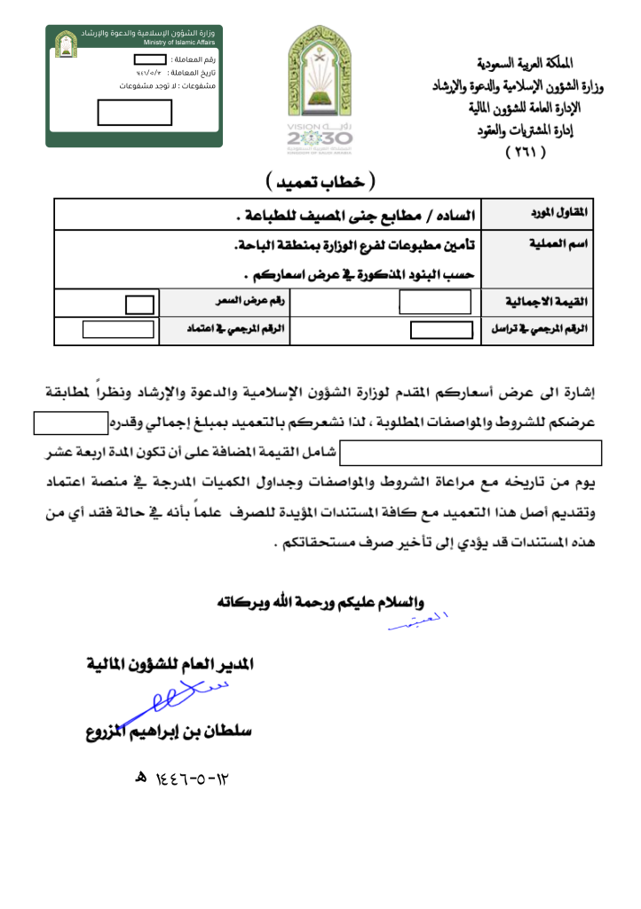 تأمين مطبوعات لفرع الوزارة بمنطقة الباحة