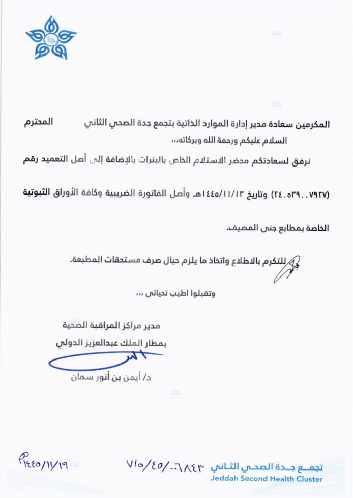 تم توريد وتركيب لوحة تعرفية لفرع وزارة الصحة بمحافظة جدة بناءً على التعميد المرفق في وقته وحينه