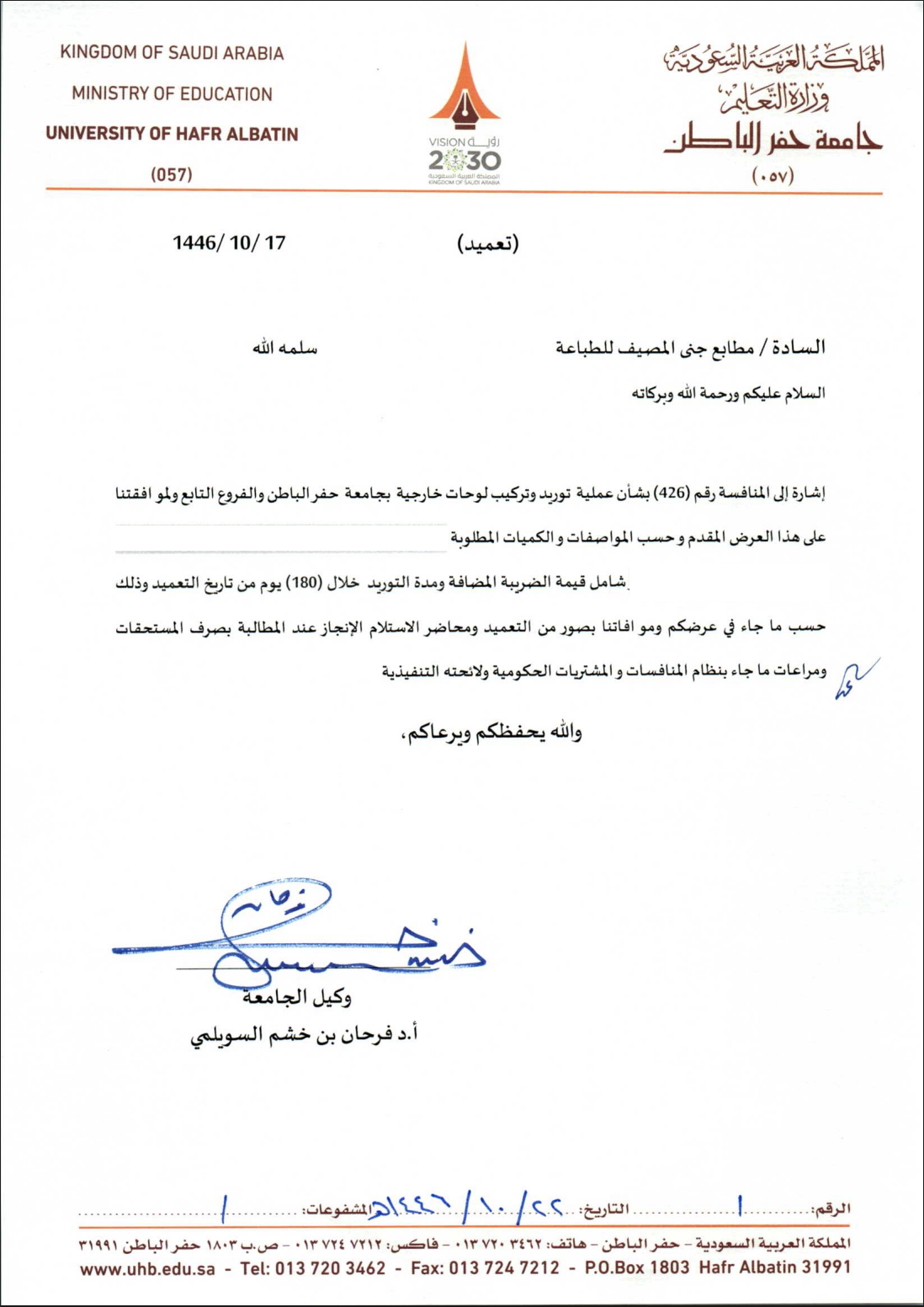 توريد وتركيب لوحات خارجية للمباني بجامعة حفر الباطن وفروعها